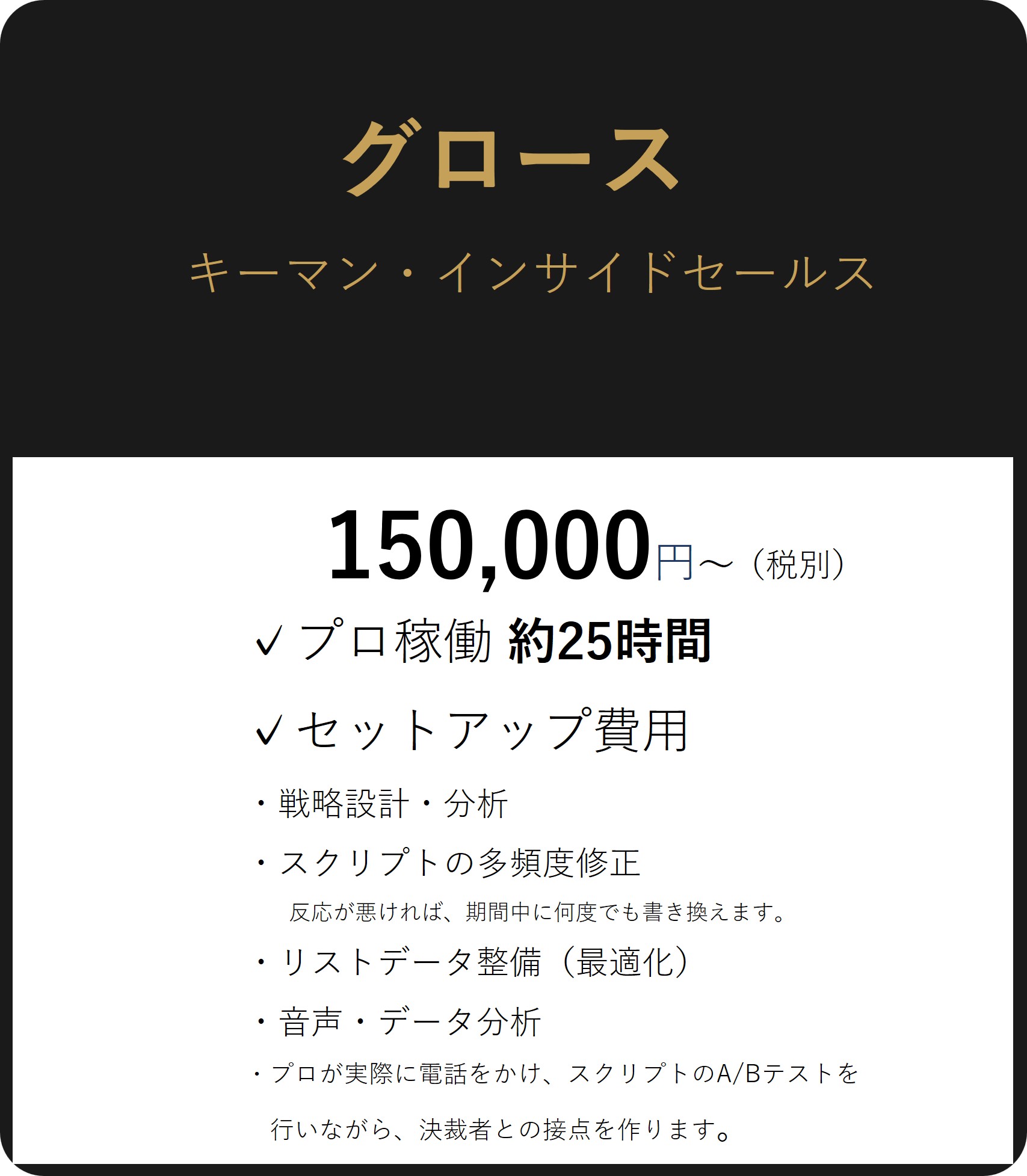 「『まずは反応を見たい』という企業様に最適。低リスクでリストの精度やスクリプトの有効性を検証できる、テストマーケティング用プランです。」